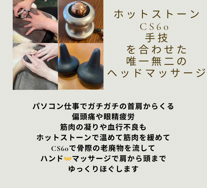 頭部に繋がる肩首をほぐしてから頭皮の硬さをじんわりほぐす磁力線のでる特殊器具【cs60 】とハンドを合わせた他にはない施術です45分 4,500円